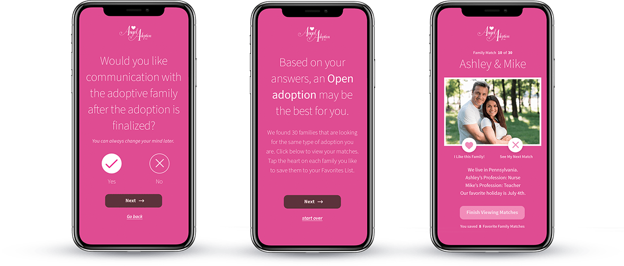 Get StartedAnswer a few quick questions to find out what might be the best type of plan for you. Then swipe through adoptive families of the same type and pick your favorites.